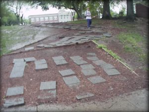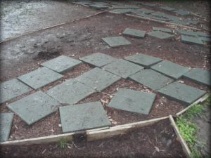 a series of flat stepping stones laid systematically into a bed of one